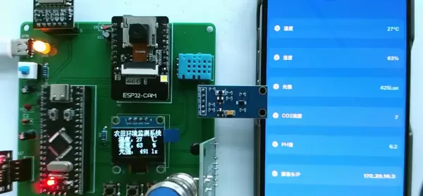 本项目以STM32F103C8T6微控制器为中心,开发了一套针对农田环境监控的系统。这套系统主要由控制中心、输入端和输出端三大部分构成。其中,控制中心使用STM32F103C8T6微控制器,承担着收集外部信息并处理的任务,随后根据处理结果控制输出设备。输入端则集成了七种不同的模块:ESP32-CAM摄像头负责拍摄图像并保存至SD卡;DHT11温湿度感应器用以测量农田的温度与湿度;BH750光感元件用于监测光线强度;CO2浓度探测器用来检测空气中的二氧化碳水平;PH值检测单元可以测定土壤酸碱度;独立按钮实现拍照功能以及界面之间的切换;而电源线路确保了系统的正常供电。输出端包含了两部分:OLED屏幕用于显示系统标题、温湿度读数、光照强度、CO2浓度及PH值等信息;WiFi组件则通过互联网连接至阿里云平台,不仅上传所有监测到的数据,还支持远程人脸识别功能。本项目的实施,借助多种传感技术和模块的融合,完成了对农田环境全方位的监控与数据传输,为农业生产的决策提供了科学的数据支撑和技术保障。
