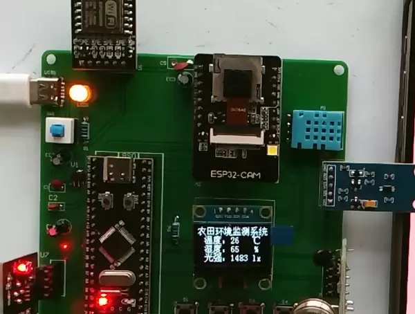- ESP32-CAM摄像头模块:捕获图像并保存到SD卡,用于监控农田状况和人员活动。