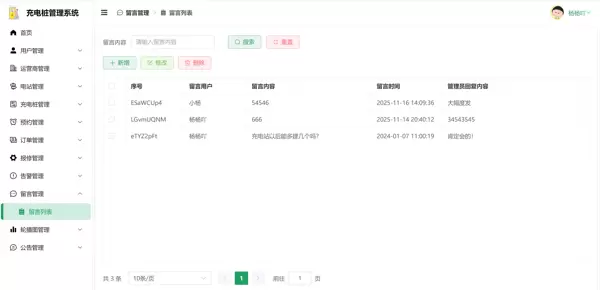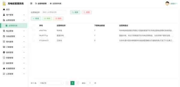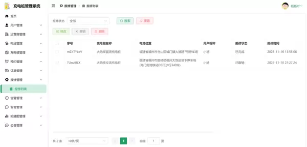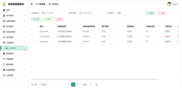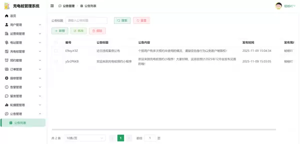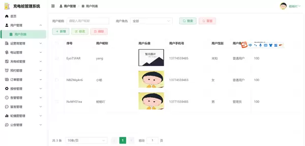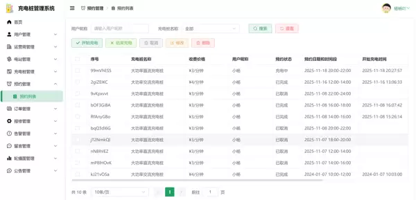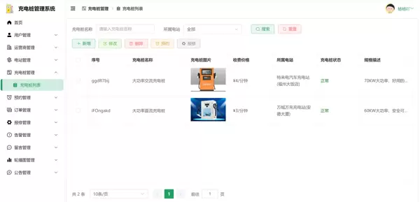 项目功能分为两个主要角色:普通用户和管理员。普通用户可以执行诸如登录注册、管理个人信息、查看运营商信息、电站信息、充电桩信息、预约充电桩、报修充电桩、管理个人预约记录、启动充电、停止充电、查看个人订单详情、支付订单、查阅公告信息、提交及查看报修记录、查看警告信息、留言及查看留言等操作。管理员则能够查看所有的数据统计、管理用户资料、运营商资料、电站资料、充电桩资料、预约资料、订单资料、报修资料、警告资料、留言资料以及公告资料等。