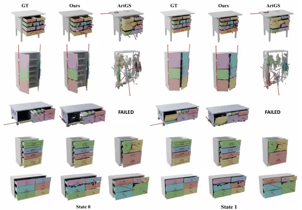 上图直观地显示了在处理多部件物体时,ArtGS可能会出现部件分割错误(如将多个抽屉误归为同一组)甚至训练失败的情况。而GaussianArt能够精准地识别并分割出每个独立的运动部件,同时准确估算其运动参数,生成高质量的数字孪生模型。