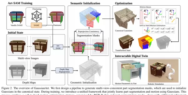 良好的初始化对于成功的重建至关重要。部件分割方面,作者首先微调了一个强大的图像分割模型 SAM2,使其能够专门用于分割关节物体的部件,从而得到名为 Art-SAM 的模型。随后,通过多视角传播和一致性验证,生成每个视角下高质量且一致的部件分割掩码。