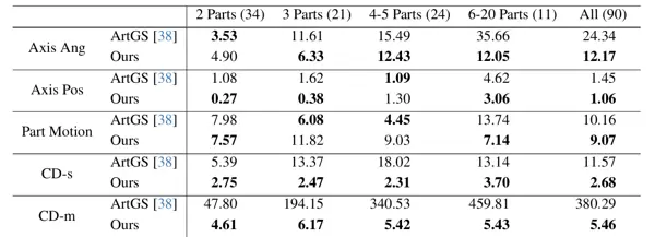 根据上述表格数据,当物体部件数量较少(2-3个)时,ArtGS与GaussianArt在某些运动指标上的表现相近。但随着部件数量的增多,ArtGS的性能显著下滑,尤其是在动态部件的几何重建(CD-m)方面,误差大幅上升,这表明其基于聚类的初始化方法在面对复杂场景时效果不佳。相反,GaussianArt依靠其稳健的初始化过程和统一的优化框架,在各种部件数量的测试条件下,均能维持较低的几何重建误差和较高的运动估计准确性,显示出良好的可扩展性和稳定性。