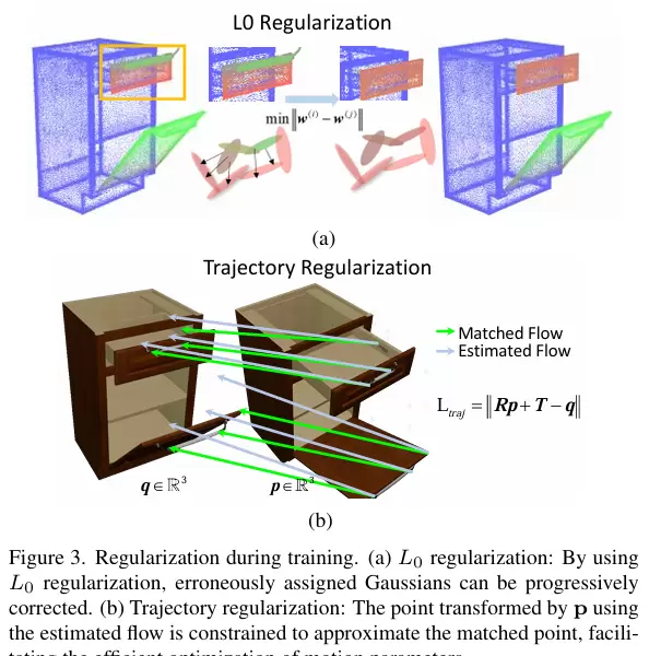 这种分配方式将高斯基元视为刚性部件的一部分,使运动参数的优化更为直接和高效。为进一步精细化运动参数,模型引入了轨迹正则化项 \( L_{traj} \)。此正则化项通过匹配两帧图像中的特征点,并将其提升到三维空间,进而限制一个部件上的点在经过学习到的变换 \( (R_j, T_j) \) 后,应与其在另一帧中匹配的三维点位置尽可能接近。数学表达式为:\( L_{traj} = \sum_{j \in F(M)} \| (R_j p_j + T_j) - q_j \| \)。