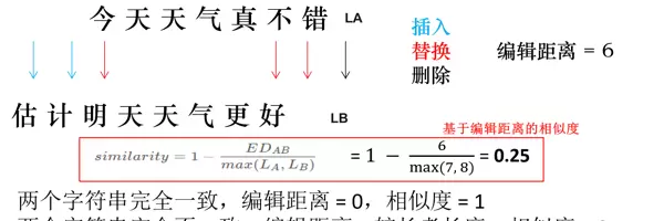 例如:“今天天气真不错” vs “估计明天天气更好” 的编辑距离为6。