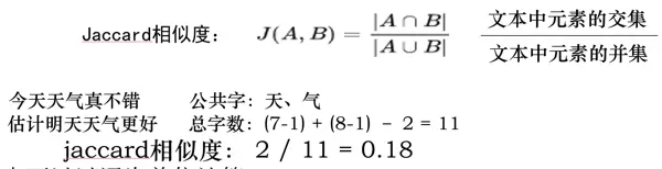 例如:“今天天气真不错”(7字) vs “估计明天天气更好”(8字) —— 共同字为“天、气”,相似度为2/(7+8-2)=0.18。