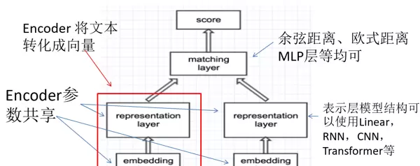 其核心思路是首先利用相同的编码器(Encoder)将两段文本转换成固定维度的句子向量,然后通过计算这些句子向量之间的相似度(例如使用余弦相似度或欧氏距离)或者通过多层感知机(MLP)来评估匹配程度。
