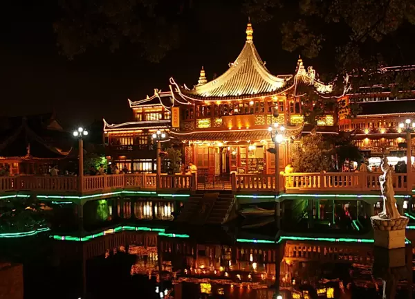 位于九曲桥尽头的湖心亭,是一座八角形的双层楼阁,建于清朝乾隆年间,起初作为茶亭使用,现在已成为豫园的一个标志性建筑。湖心亭的屋顶设计为歇山顶,覆盖着绿色的琉璃瓦,飞檐翘角,屋脊上装饰有龙、凤、狮子等吉祥动物的雕刻,充分体现了清朝建筑的华美风格。游客可以登上湖心亭,远眺荷花池和豫园的全貌,也可以在亭内的“湖心亭茶楼”享受上海特有的“龙井绿茶”和“蟹粉小笼”,体验老上海的悠闲生活方式。