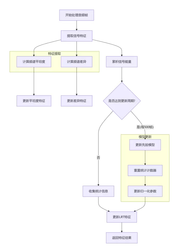 - 特征提取阶段:每帧实时计算频谱平坦度、频谱差异等基本特征。