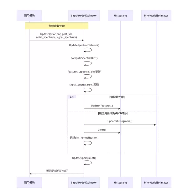 此方法用于根据输入的信号和噪声频谱数据更新信号模型估计器中的特征。