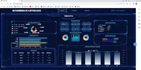 完成模型训练后,系统能够使用该模型对新的中文文本数据进行类别预测。用户只需将待预测的文本输入到系统中,系统就会调用已训练好的随机森林分类器进行预测,并提供预测结果。为了使预测结果和数据分布情况更加直观,系统还提供了丰富的可视化功能。通过Vue框架的前端界面,用户可以查看各种疾病的发病率、地域分布、时间趋势等信息以及详细的预测数据。这些图表不仅有助于医疗工作者更好地理解数据,还能辅助他们进行疾病预测与决策。
