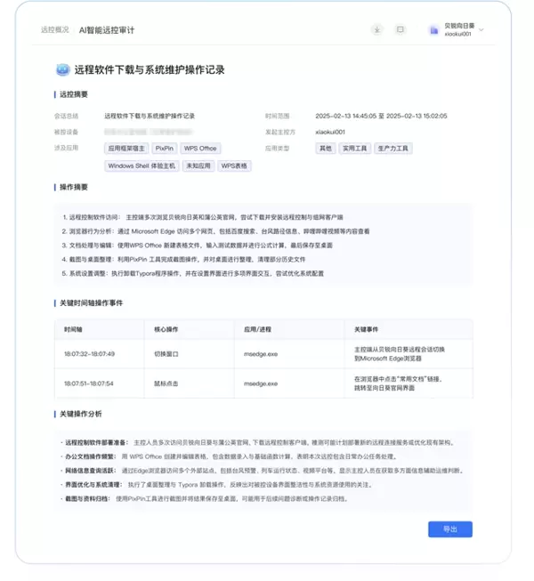 此外,贝锐向日葵还引入了AI日志审计功能,能够自动分析远程控制过程,并自动生成审计报告,大大提高了审计工作的效率。报告中包含了对整个远程控制过程的AI解析、关键操作的时间线节点以及具体的行为总结(例如文件复制、配置更改等)。