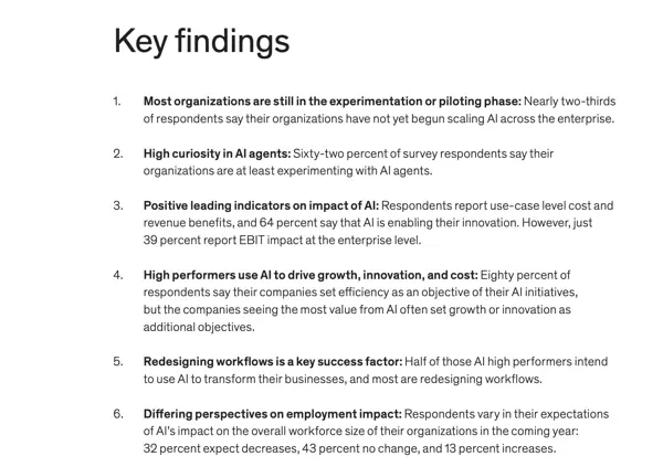 最近,麦肯锡与QuantumBlack合作发布了2025年最新版《2025年人工智能的现状:智能体、创新和转型》(《The State of AI in 2025: Agents, Innovation, and Transformation》)。该报告基于对全球近2000位企业高管和从业者的调查数据,揭示了当前AI在企业中的应用状况。简而言之: