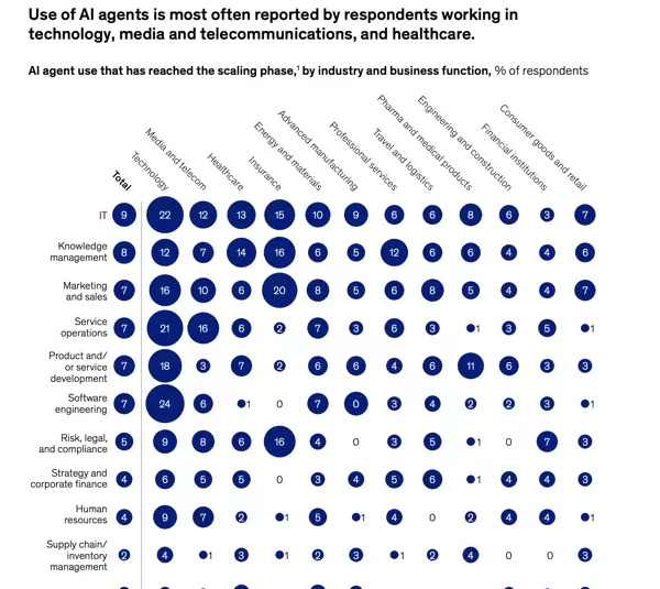 报告中最引人注目的部分是AI智能体——那些能够自主规划和执行多步骤任务的“智能助手”。62%的公司正在试验或试点AI智能体,23%的公司已在某些部门开始规模化部署。不过,每个具体业务部门中真正大规模应用的比例均不超过10%。目前,AI智能体最常见的应用场景包括IT(如自动服务台)、知识管理(深度研究和资料汇总)、软件工程和服务运营等领域。科技、媒体电信和医疗保健行业的受访者报告称,AI智能体的落地比例明显更高。