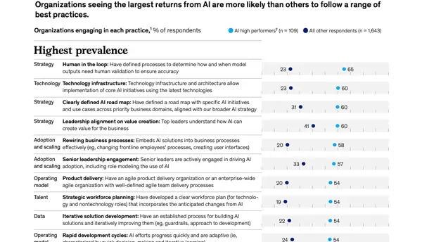 好消息是,AI已经开始在降低成本和增加收入方面发挥作用。64%的受访者明确表示AI正在帮助他们实现创新。然而,只有39%的公司看到了企业级EBIT(息税前利润)的显著改善。这主要是因为高绩效公司和普通公司在AI应用上的策略存在显著差异。