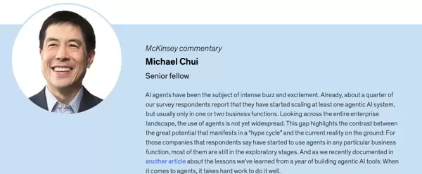 麦肯锡高级合伙人Michael Chui指出:“AI智能体确实很受欢迎,但要真正做好却非常困难。许多人看到的是炒作,而我们看到的是许多公司仍在探索阶段。”