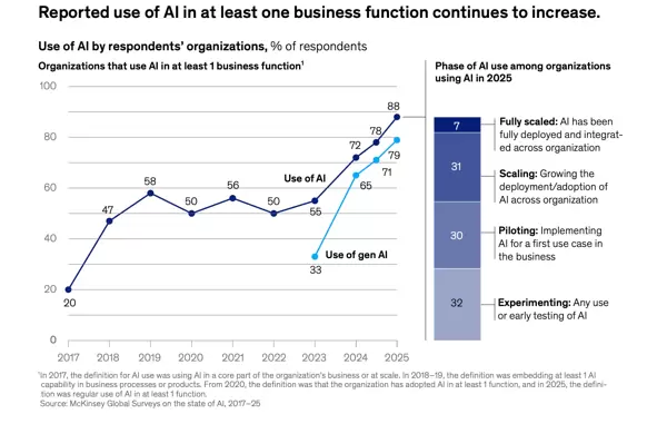 据88%的受访者反映,他们的公司在至少一个业务部门中定期使用AI,这一数字较去年的78%有所增长。生成式AI(Gen AI)的使用率也从65%-71%飙升至79%。然而,真正实现全企业级规模化的公司仅占7%,31%的公司正在扩大部署,30%的公司刚刚开始试点,而32%的公司仍处于实验阶段。这意味着,虽然AI已成为基础设施的一部分,但大多数公司尚未将其转化为实际生产力。