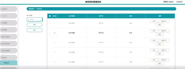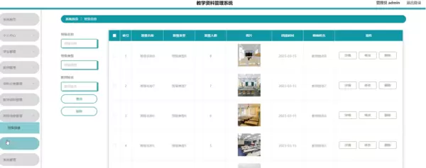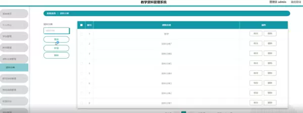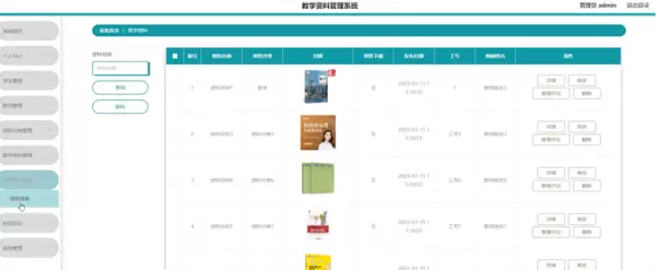在教学资料管理页面,管理员可以输入资料名称、分类、封面、下载、发布日期、工号和教师姓名等信息,执行查询或删除教学资料的操作,如下图所示: