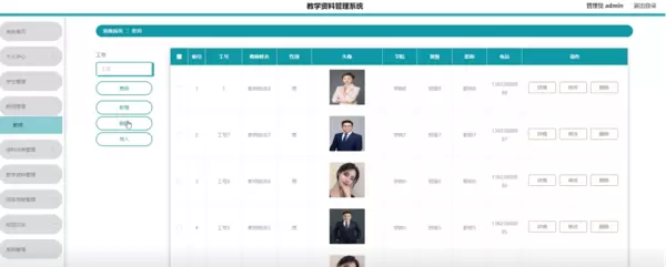 在教师管理页面,管理员可以输入工号、教师姓名、性别、头像、学院、班级、职称和电话等信息,执行查询、添加或删除教师信息的操作,如下图所示:
