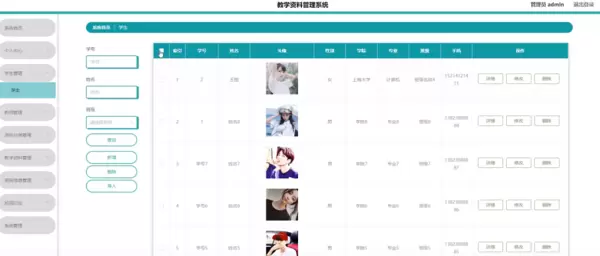 在学生管理页面,管理员可以输入学号、姓名、头像、性别、学院、专业、班级和手机号等信息,执行查询、添加或删除学生信息的操作,如下图所示: