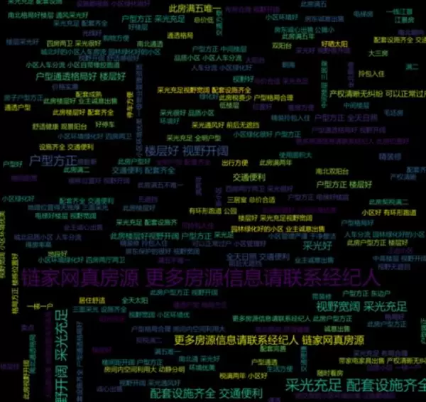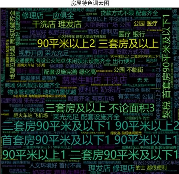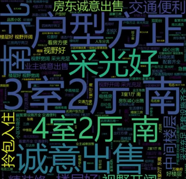 房源标题词云图:提炼出市场上流行的宣传关键词,反映了购房者的关注重点。词云图的生成代码如下所示。