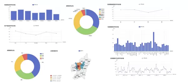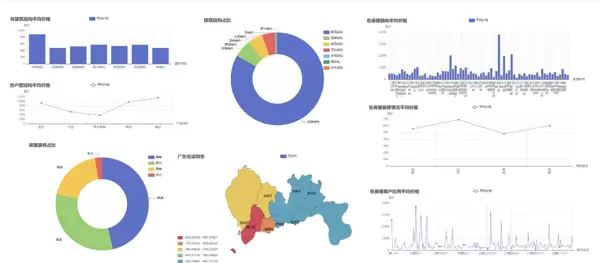 数据可视化大屏整合了多个核心指标,如房源数量、均价、户型分布等,旨在全方位展示市场的总体状况,为决策提供数据支持。
