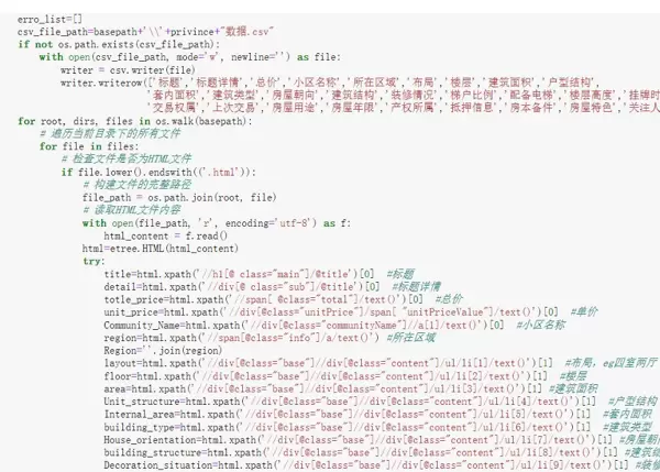 本项目的数据来源是链家网站的二手房部分,通过分析网页URL的模式,制定了按城市和区域划分的爬虫策略。首先抓取目标城市各区域的URL,然后按照分页规则遍历每个页面上的房源,最终下载单个房源的HTML文件并从中抽取所需信息。
