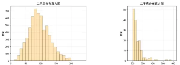 房价分布直方图:鉴于高价房源比例极低,以1000万元为界限分开展示高低价房源,以便更清晰地看到价格的集中区间。