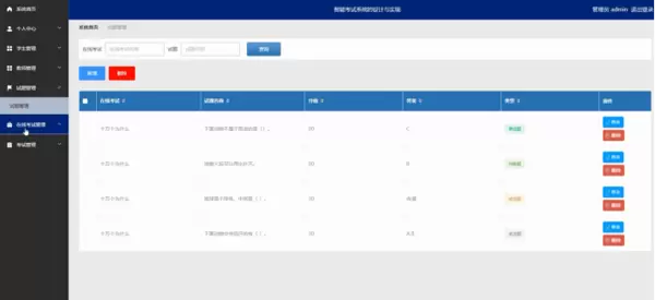 管理员点击“试题管理”,进入试题页面,输入在线考试和试题信息以查询、添加或删除试题列表,并可根据需要修改或删除试题的详细信息。如图5-5所示。