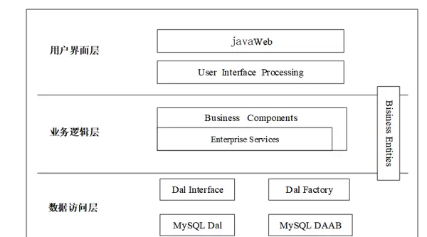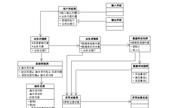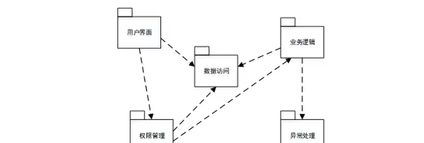根据上述架构设计原则和目标,我们建立了系统的架构设计模型。信息系统中的对象被划分为三个层次:用户界面层、业务逻辑层和数据访问层(见下图4-2)。此外,我们提取了各层中的通用组件,如权限管理和异常处理,形成了如图4-3所示的包图。