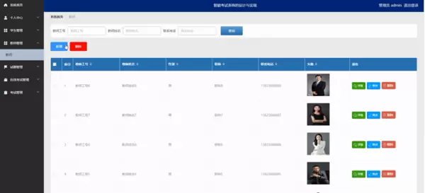 点击“教师管理”后,管理员可以在教师页面输入教师编号、姓名和电话号码来查询、修改或删除教师列表,并根据需要查看、修改或删除教师的详细信息。如图5-4所示。