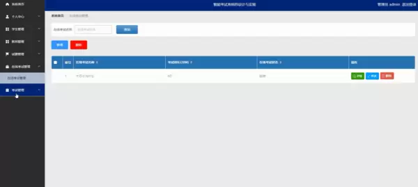 管理员点击“在线考试管理”,进入在线考试页面,输入在线考试名称以查询、添加或删除在线考试列表,并可根据需要查看、修改或删除在线考试的详细信息。如图5-6所示。