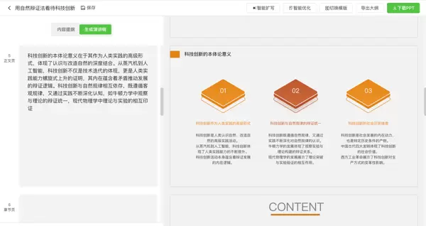 3. 自动生成讲稿:点击生成演讲稿按钮,系统将逐页自动生成讲稿,帮助学生理清思路,更好地应对答辩。