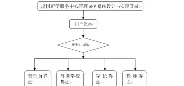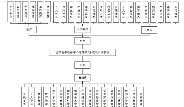 系统分为四个角色,根据每个角色的权限,设计了四大模块:管理员模块、外国学校模块、家长模块和教师模块。管理员模块专注于整个系统的管理,提升了管理效率和标准。系统的总体模块功能设计如下图所示: