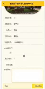 在“国外学校”界面,用户可以查看学校账号、学校名称、负责人、学校地址、联系电话、占地面积、点击次数、师资力量和学校详情等信息,并可进行评论或收藏操作。国外学校详情界面如图5-4所示。