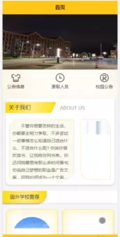 用户注册登录后进入的第一个界面是App首页,在这里可以看到导航条,内容涵盖首页、国外学校、公告信息、录取人员、校园公告和个人中心等。App首页界面如图5-3所示。