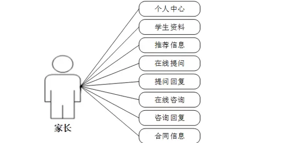 家长模块的主要设计在于登录成功后,用户能够对个人中心、学生资料、推荐信息、在线提问、提问回复、在线咨询、咨询回复和合同信息等功能进行详细操作。