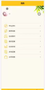 家长登录成功后,点击“我的”进入个人页面,可对个人中心、学生资料、推荐信息、在线提问、提问回复、在线咨询、咨询回复和合同信息等进行详细操作。家长功能界面如图5-7所示。