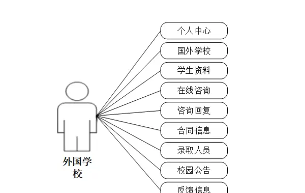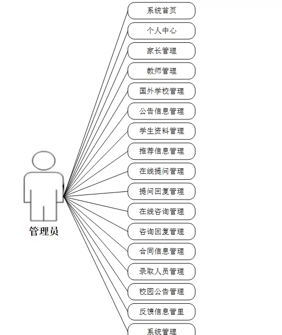 本系统分为管理员、外国学校、家长和教师四大模块,管理员拥有最大权限,可以管理系统的全部功能;其次是外国学校、家长和教师。各模块的用例如下所示: