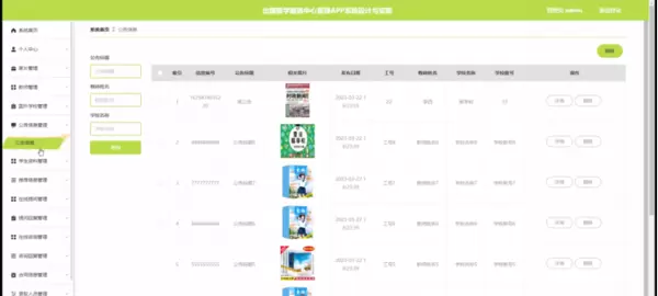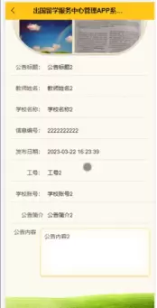 在“公告信息”界面,用户可以查看信息编号、公告标题、相关图片、发布日期、学校账号、学校名称和公告简介等信息。公告信息详情界面如图5-5所示。