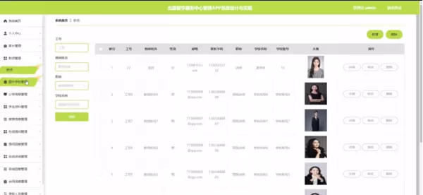 当管理员点击“教师管理”时,会进入到一个可以输入教职工编号、教师姓名、职位以及所属学校名称的页面,在这里可以执行搜索、创建、移除教师条目等操作,并且可以根据实际情况查看、编辑或移除教师的详细资料,详见图5-12。