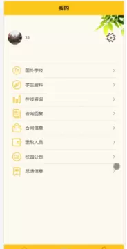 国外学校登录成功后,点击“我的”进入个人页面,可对个人中心、国外学校、学生资料、在线咨询、咨询回复、合同信息、录取人员、校园公告和反馈信息等进行详细操作。国外学校功能界面如图5-6所示。
