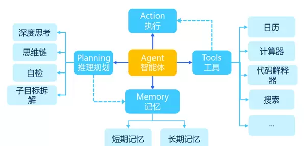 一个典型的Agent架构闭环将Agent、Planning、Memory和Tools紧密结合在一起: