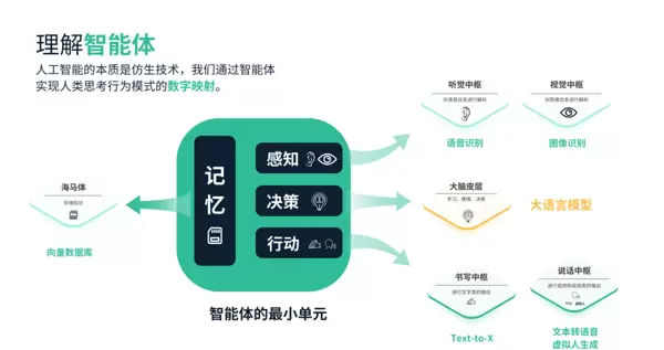 智能体是最小的功能单元,具备感知、决策、行动和记忆的能力。