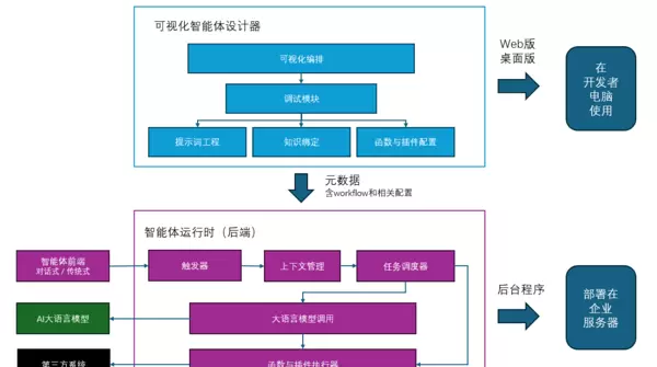 在实际生产环境中,智能体的运行架构包括可视化设计、元数据配置和复杂的后端运行时组件(如触发器、上下文管理、任务调度器等):