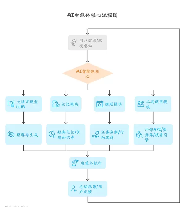 AI Agent超越了传统的聊天机器人,成为一个能够设定目标、感知环境、自主规划、决策并采取行动的“数字员工”。其核心优势在于自主性和处理复杂任务的能力,这两方面都是传统AI应用难以匹敌的。AI智能体的操作流程通常包括感知、规划、行动和反馈四个阶段,形成一个闭合循环。