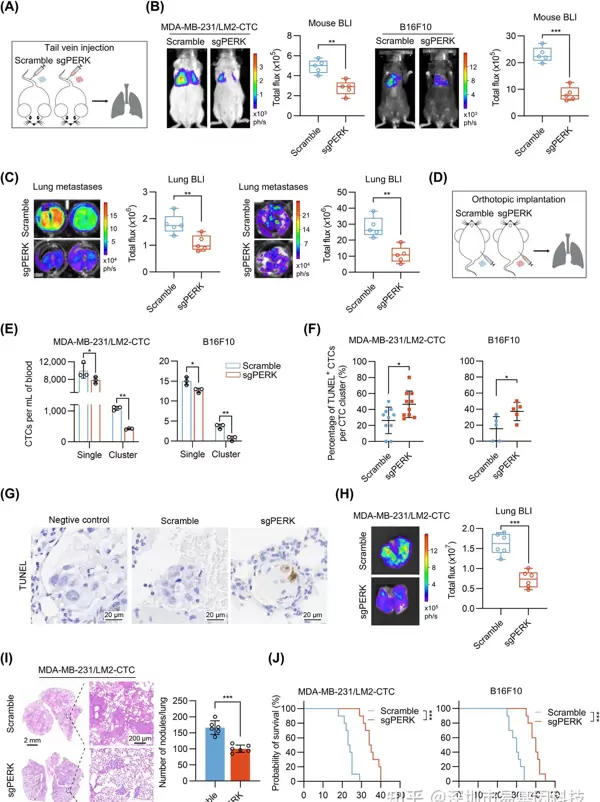 将PERK-KO CTC clusters注入小鼠尾静脉后,观察到肺部转移结节的数量明显减少。在原位移植PERK-KO肿瘤细胞的小鼠中,血液中的CTC clusters数量也有所下降,同时簇内的TUNEL阳性细胞数量增加。临床数据表明,PERK高表达与乳腺癌和黑色素瘤患者的不良预后有关,进一步证实了PERK在肿瘤转移中的促进作用。