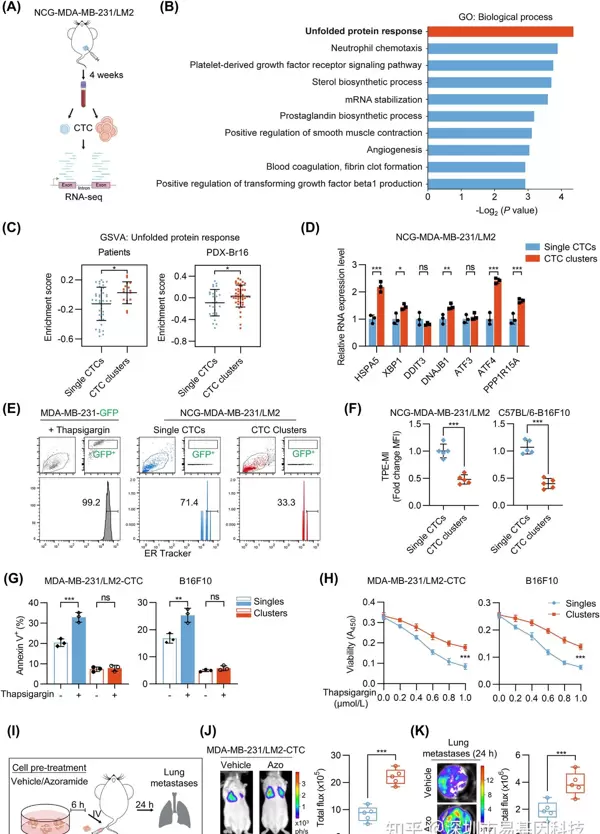 RNA-seq分析显示,CTC clusters中相关基因显著富集,UPR通路基因(如HSPA5、XBP1)显著上调。CTC clusters表现出更强的适应性UPR反应,能够有效抵抗内质网应激(ERS)诱导的细胞死亡。在模拟血液环境的悬浮培养中,CTC clusters的内质网应激标记物(如TPE-MI)积累低于单CTC,且对ERS诱导剂衣霉素的凋亡抵抗更强。预先用UPR激活剂Azoramide处理CTC clusters可增强其肺转移能力,表明UPR激活是CTC clusters适应血液环境的关键策略。