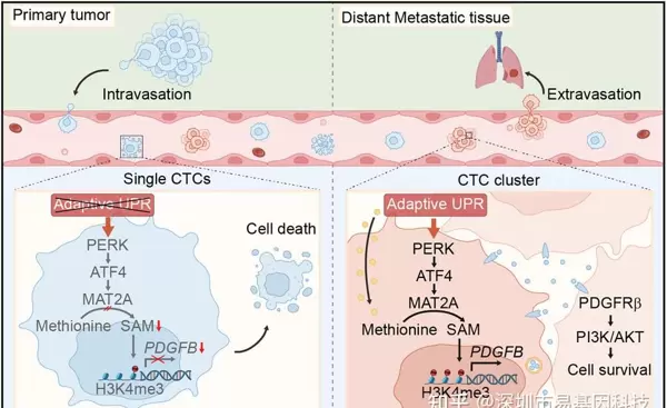 本研究揭示了PERK/MAT2A/PDGFB轴在赋予CTC clusters血液中适应性存活能力方面的作用。针对这一生存信号通路的干预可能成为治疗转移性癌症的一个有前景的策略。
