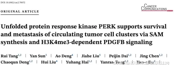 Tang R, Sun Y, Deng A, et al. Unfolded protein response kinase PERK supports survival and metastasis of circulating tumor cell clusters via SAM synthesis and H3K4me3-dependent PDGFB signaling. Cancer Commun (Lond). 2025 Nov 10. doi: 10.1002/cac2.70072.