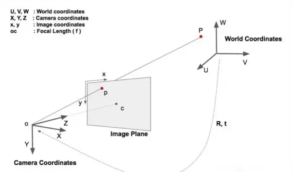 一个物体相对于相机的姿态可以通过旋转矩阵(R)和平移矩阵(T)来描述。其中,平移矩阵表示物体相对于相机的空间位置关系,而旋转矩阵则表示空间姿态关系。因此,坐标系之间的转换是必不可少的。具体关系如下图所示: